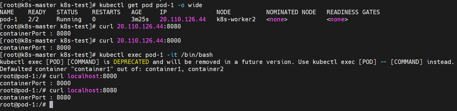 curl <pod-ip>:8000, curl <pod-ip>:8080