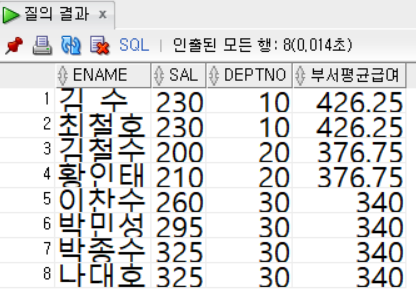 select ename, sal, deptno, (select avg(sal) from emp where deptno = e.deptno) 부서평균급여
