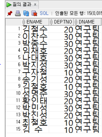select절 예제로는 사원마다 각각의 부서번호가 반복적으로 진행됨으로 특정 부서번호의 데이터 출력을 가져옵니다.