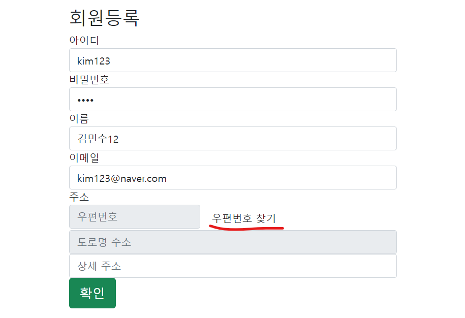 오늘은 간단한 회원가입 기능으로 도로명주소 API 사용법에 대해서 알아보았습니다.