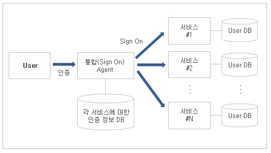- 만약 Target Service에 로그인하기 위한 정보가 admin/passwd라면, Agent가 해당 정보를 가지고 있고, 로그인할 때 유저대신 Target Service에 사용자 정보를 전달해 로그인합니다.